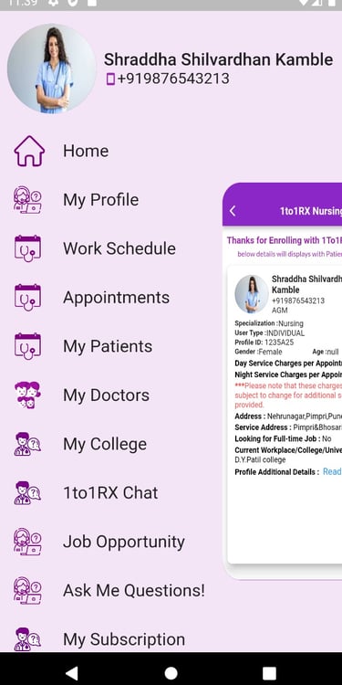 1to1rx app provides a comprehensive overview of a nurse's credentials, expertise, and experience. Users can access vital information about registered nurses, including qualifications, specializations, etc.